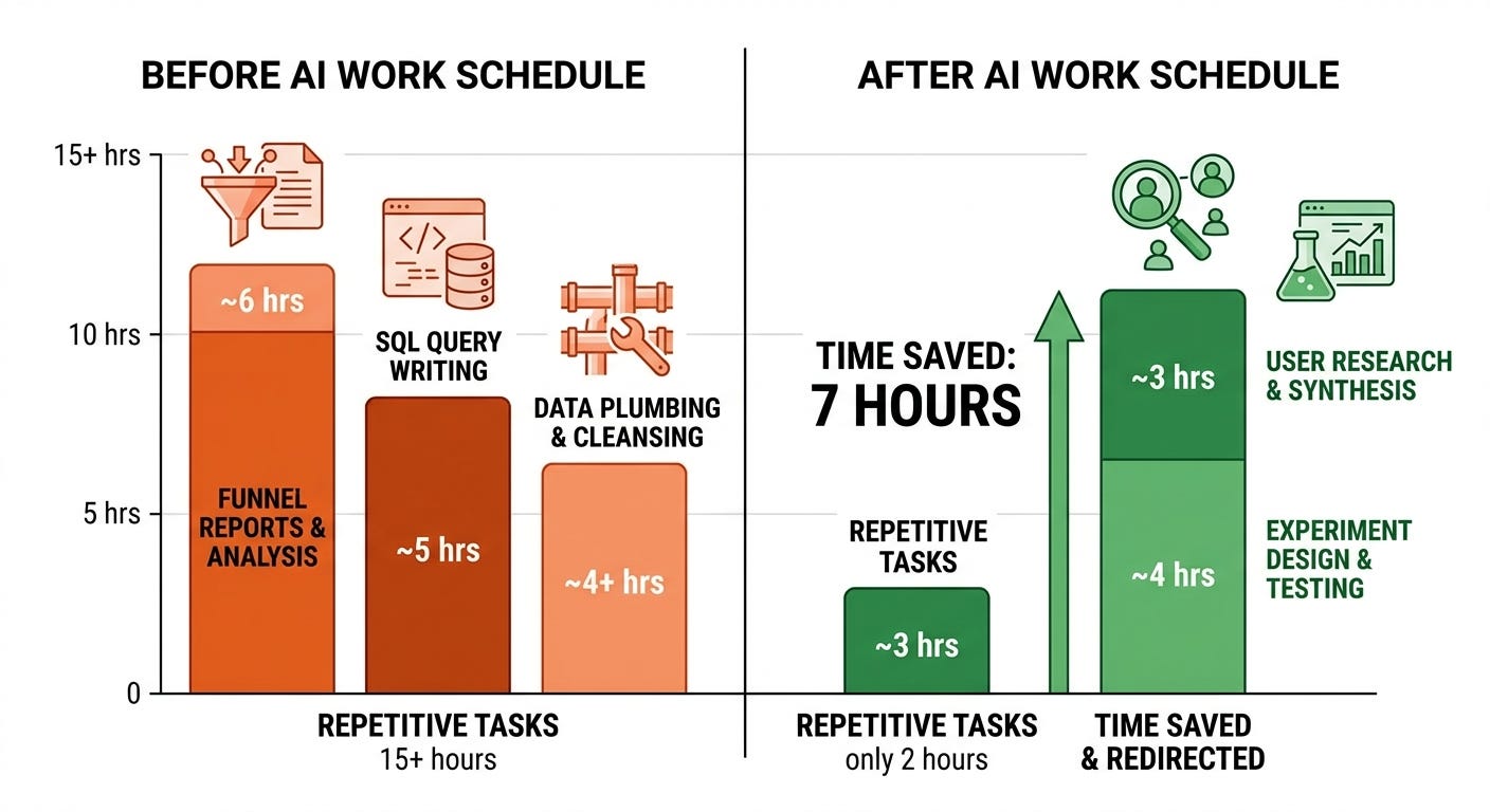 My week before ICA: Monday (3 hours on funnel reports), Tuesday (2 hours pulling LTV cohorts), Wednesday (90 minutes on experiment briefs), Thursday (2 hours investigating metric drops), Friday (ad-hoc requests).