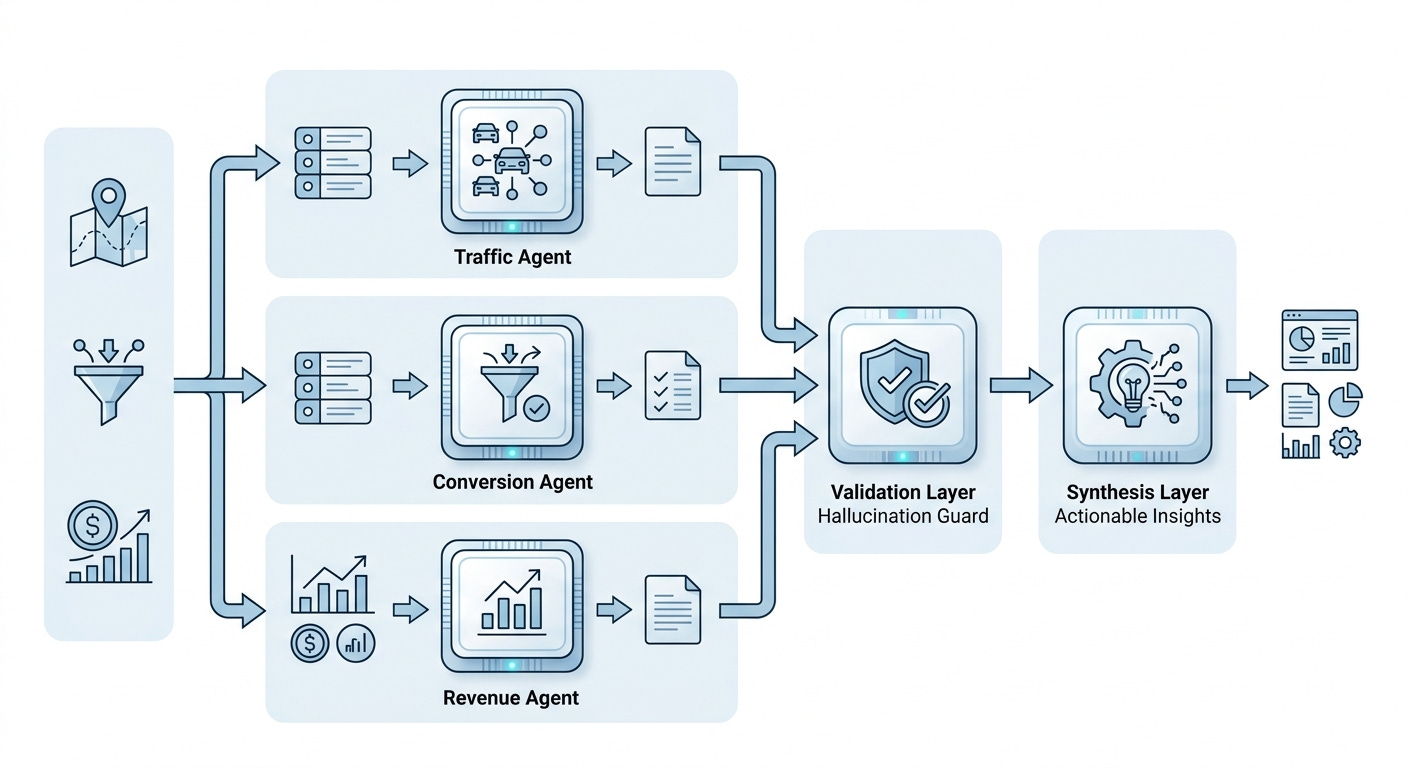 This architecture matters because single-agent systems hallucinate more frequently. By splitting responsibilities and adding validation layers, I reduced bad outputs from ~30% to ~7%.